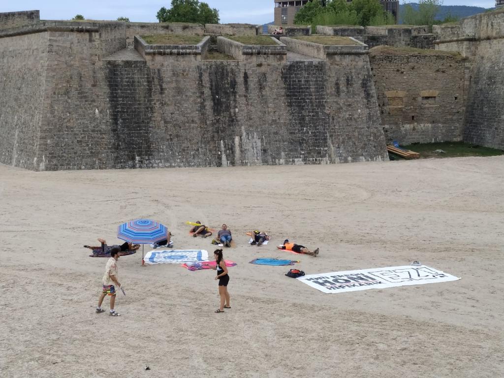 El colectivo contrario al concurso de hípica en Pamplona, hipikarik ez Iruñea, ha realizado este lunes una acción reivindicativa simulando una jornada de playa en los fotos de la Ciudadela. "Gracias, Maya, por la playa. ¿Y ahora qué?", se preguntan.