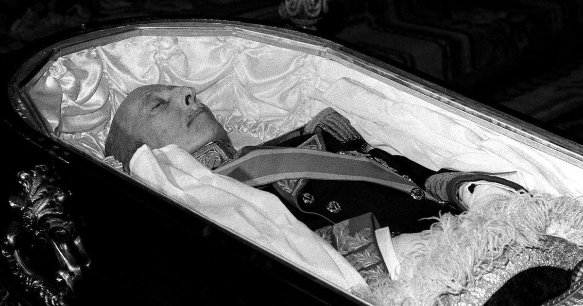 El féretro con los restos mortales de Franco en la iglesia de El Pardo durante un funeral, antes de ser trasladado al Palacio Real, donde se instaló la capilla ardiente.