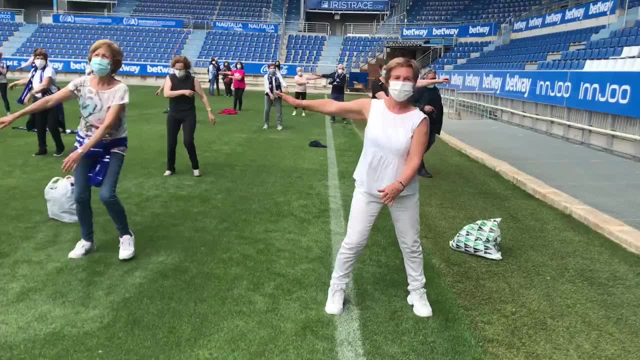 La puerta cero de Mendizorroza se ha abierto esta mañana a 210 mayores de los centros socioculturales, que han convertido el césped del Glorioso en un gimnasio al aire libre para homenajear al club por su centenario.