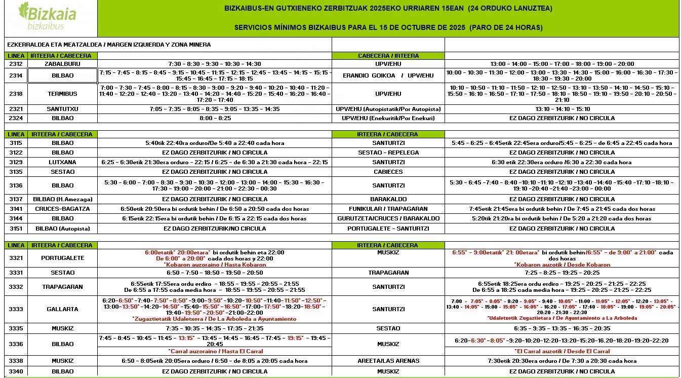 Desde Metro Bilbao informan que, aunque los servicios mínimos decretados establecían garantizar un 30% del servicio, de momento, ya bien entrada la tarde, en la misma tónica del día, se están ofreciendo el 70% de los servicios habituales de lunes a viernes.