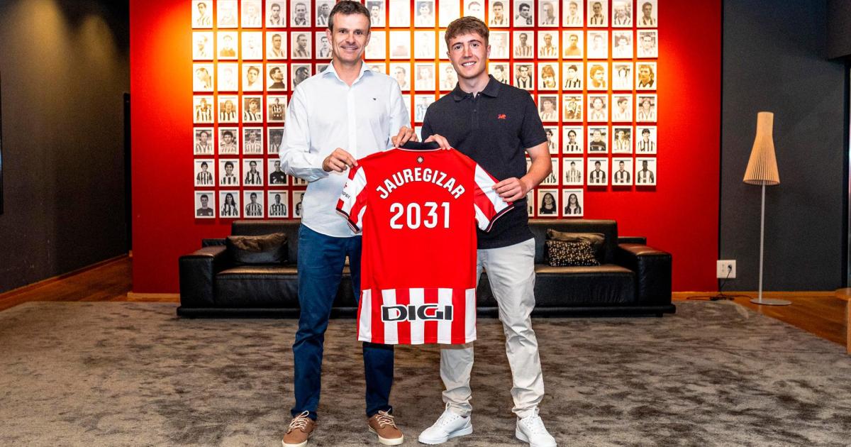 El centrocampista bermeano Mikel Jauregizar ha oficializado su renovación con el conjunto rojiblanco hasta 2031. El mediocentro, gran sensación de la temporada, amplía 4 temporadas más su vinculación con el Athletic y lo hace además sin fijar una cláusula de rescisión. Al igual que otros futbolistas como Unai Simón, el bermeano no ha establecido una cuantía para ser fichado en caso de que algún club lo deseara y ha reforzado con este gesto su compromiso con el Athletic.