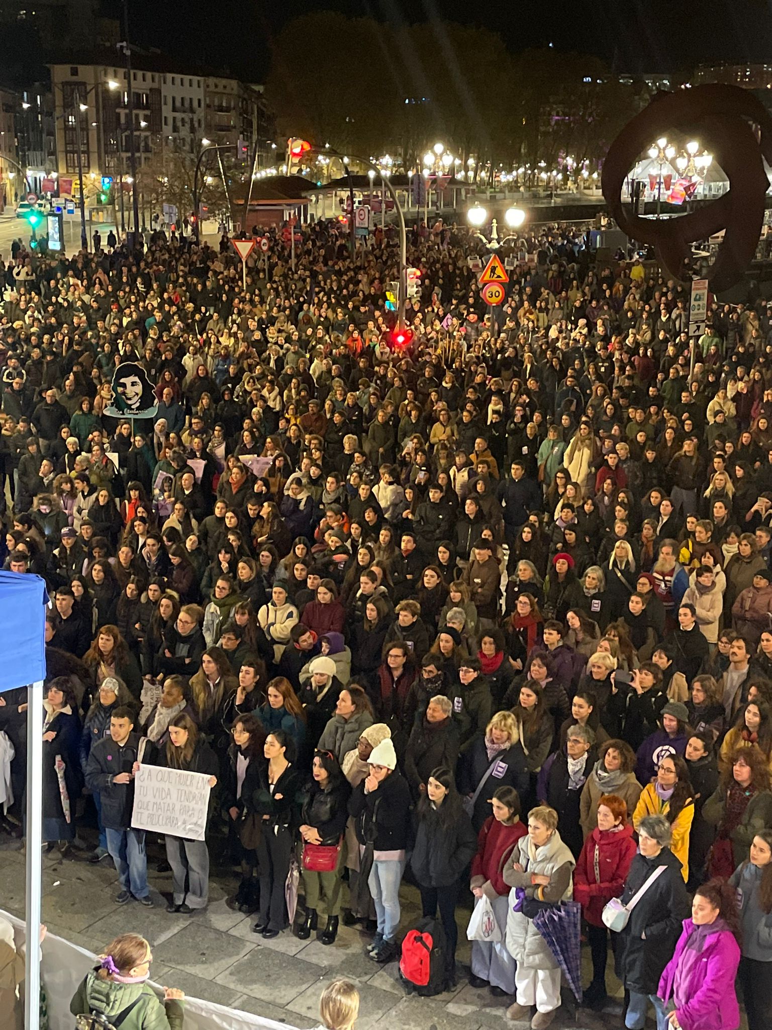 Miles de personas se han dado cita en las capitales vascas con motivo del 25-N para denunciar la lacra de la violencia machista que en lo que va de año se ha cobrado la vida de 38 mujeres en el Estado. En el caso de Bilbao, con salida en el Sagrado Corazón a las siete de la tarde, se han congregado los presentes bajo la lluvia por las principales arterias de la capital vizcaína, habiendo concluido frente al Ayuntamiento. Este 25 de noviembre es el Día Internacional para la Eliminación de la Violencia contra la Mujer. Ha sido una jornada de reivindicación y movilización en todo Euskal Herria.