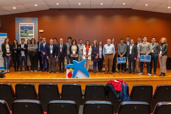 Foto de grupo de finalistas de este año con premiados, antiguos galardonados, el jurado y miembros de instituciones y CaixaBank. Oskar Montero