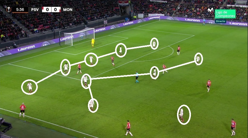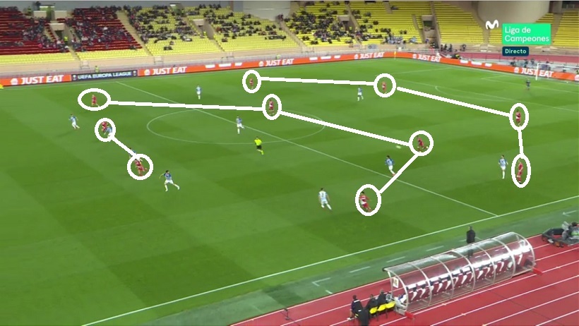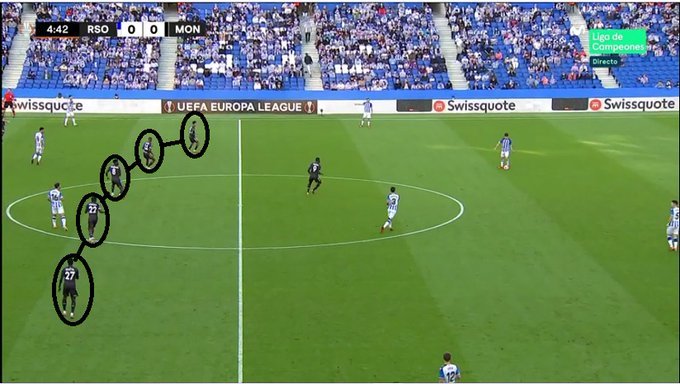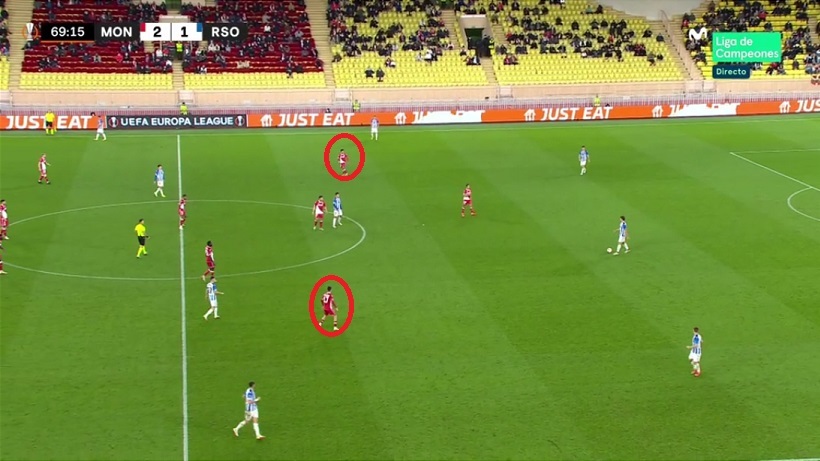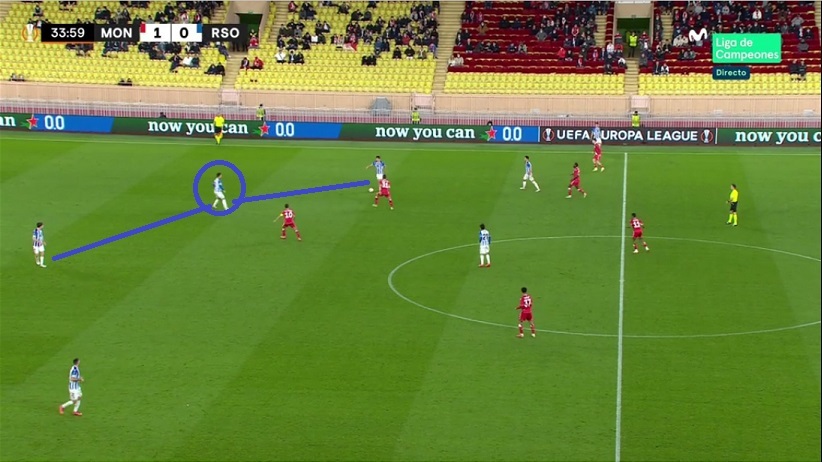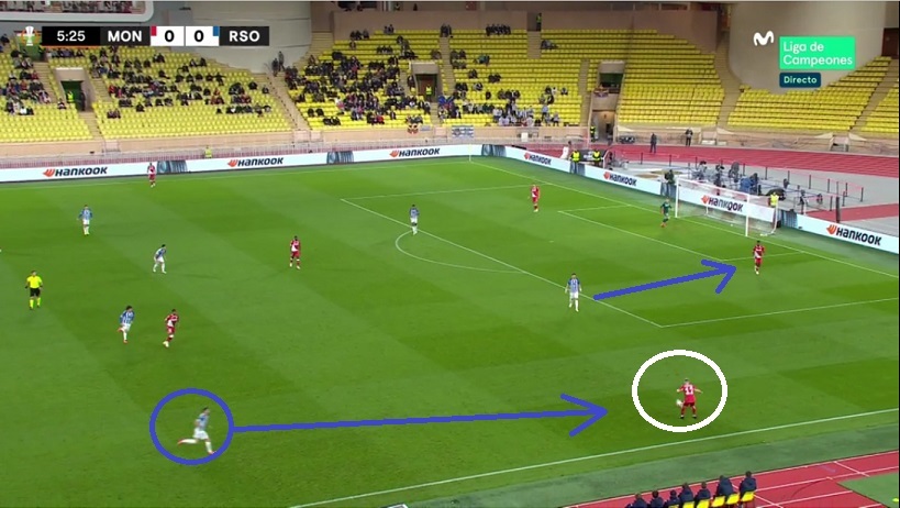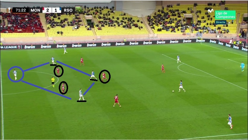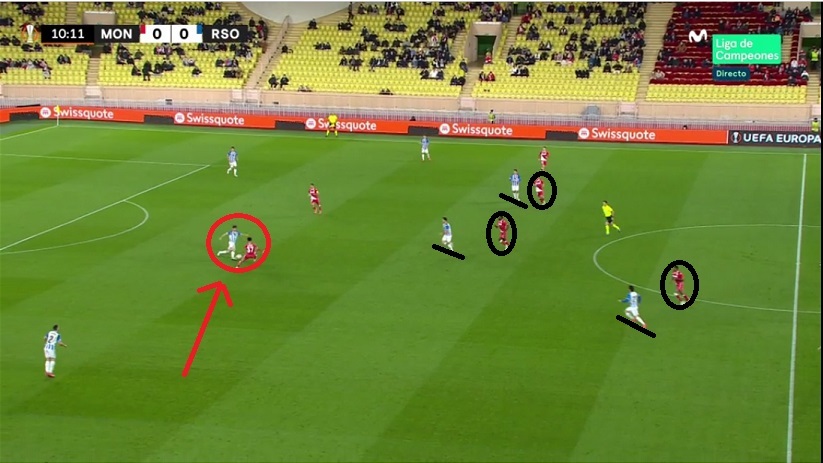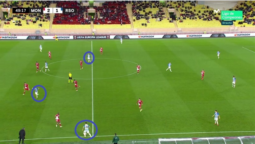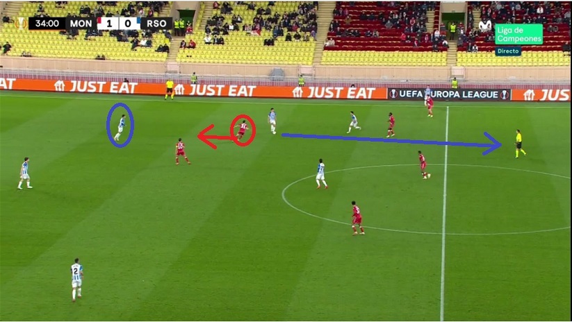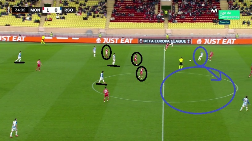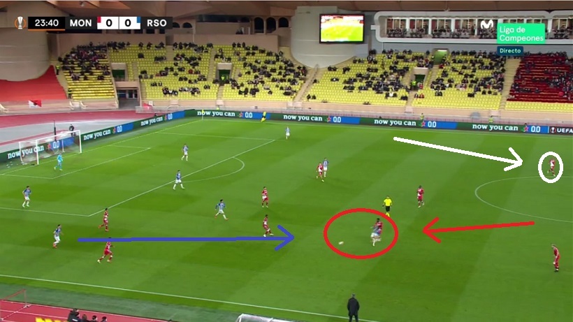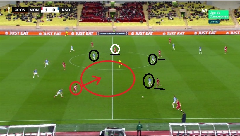 ¿Por qué la Real eleigió igualmente saltar a la presión desde fuera? Posiblemente por la misma razón que motivó al Mónaco a actuar así: controlar el juego interior rival con un tre para tres dentro. Sin embargo, para completar su superioridad durante el primer tiempo, el Mónaco supo moverse muy bien para hacer daño a la Real en zonas interiores: