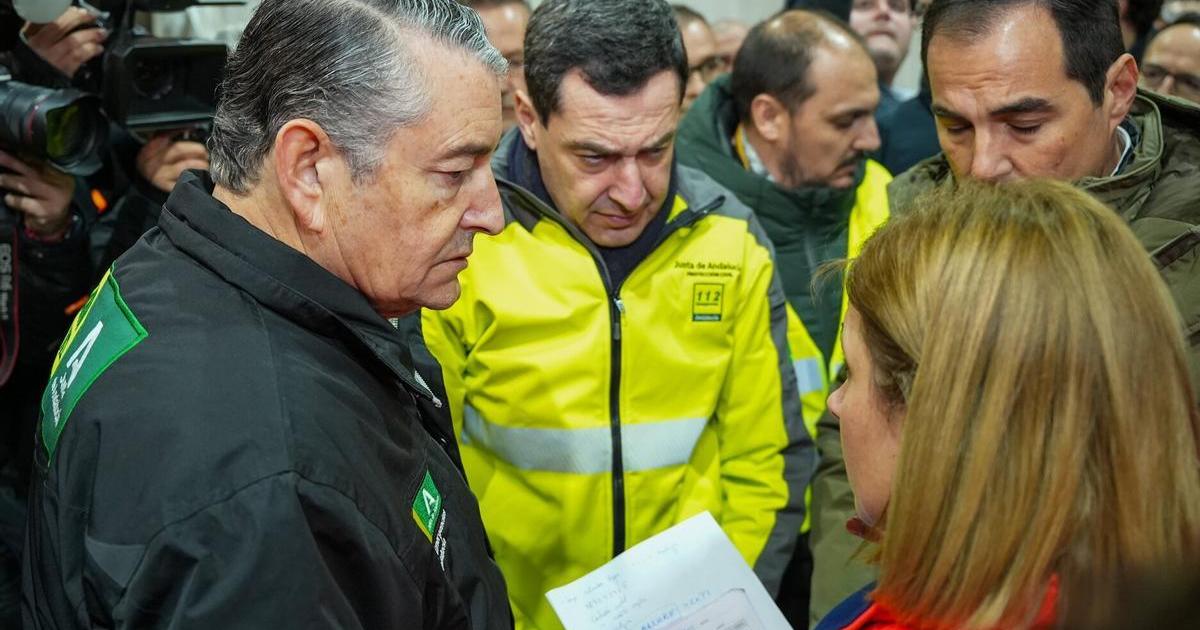 presidente de Andalucía, Juanma Moreno, y el consejero andaluz de Sanidad, Antonio Sanz, durante la visita al centro de emergencias en Adamuz.