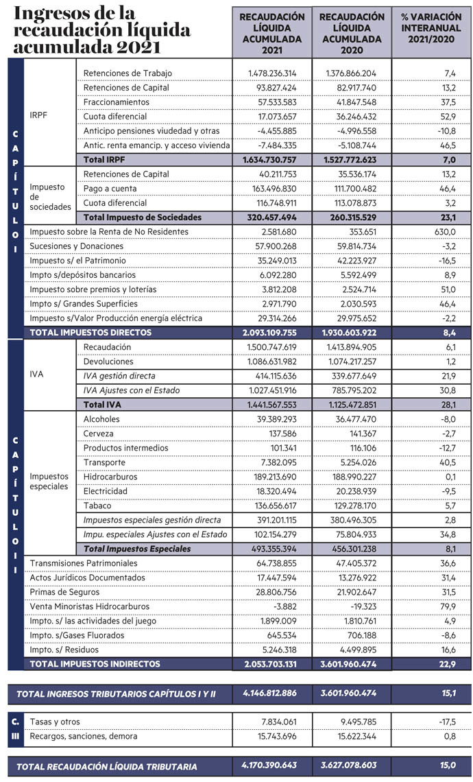 En cuanto a la evolución por capítulos, la recaudación líquida de los impuestos directos ha alcanzado los 2.093,1 millones de euros con un aumento interanual del 8,4%. En los impuestos indirectos ha sido de 2.053,7 millones de euros, con un incremento mayor que se ha situado en el 22,9%. Las tasas y otros ingresos se han reducido un 6,1% hasta los 23,6 millones de euros.