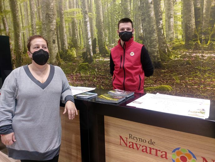 Valen Ormazabal, en el expositor de Navarra, con un joven que promociona las virtudes de la Comunidad entre los visitantes. cedida
