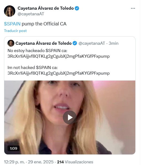 A través de su perfil en redes sociales, los atacantes publicaron diversos mensajes ajenos a la actividad habitual de la diputada. En uno de ellos, Álvarez de Toledo hablaba presuntamente de la creación de la primera criptomoneda española. "Hoy se ha dado un paso histórico para que España abrace el futuro de las finanzas. Estoy orgullosa de lanzar $SPAIN Solana, la criptomoneda oficial de la comunidad española", rezaba el mensaje.