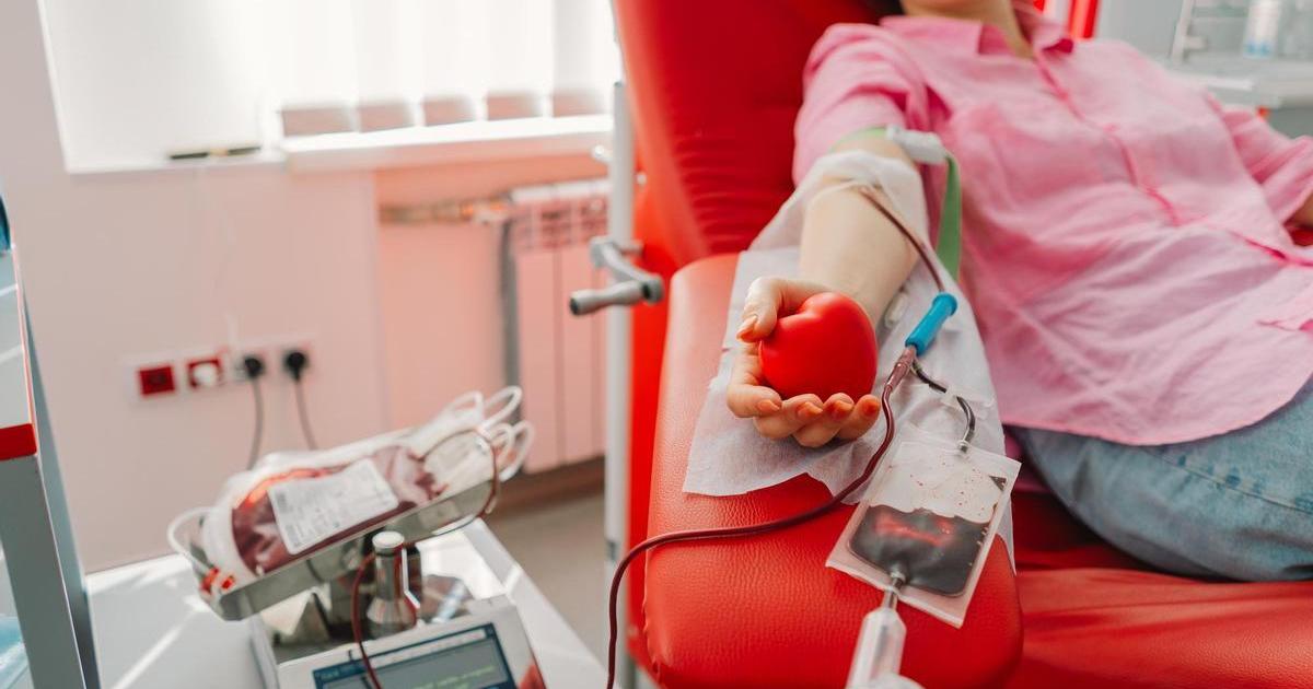 Una mujer dona sangre en un centro dependiente de un banco de sangre.
