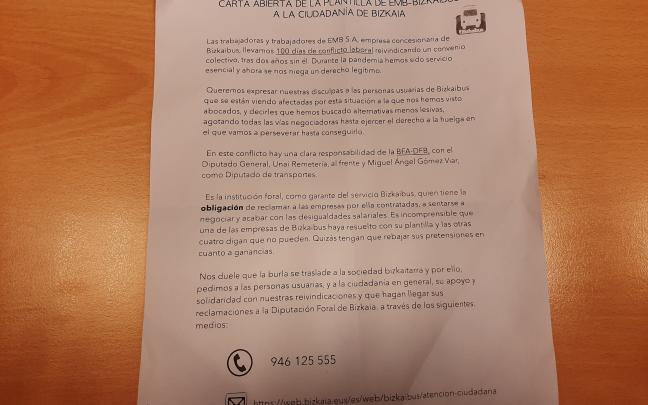 En una carta entregada a los pasajeros responsabilizan al ente foral y subrayan que continuarán con sus movilizaciones hasta "conseguirlo"