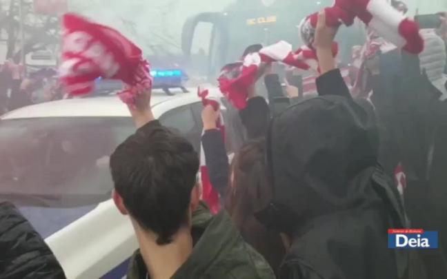 Un nutrido grupo de seguidores rojiblancos ha brindado una calurosa despedida al autobús de los leones, que vuelan ya hacia Valencia