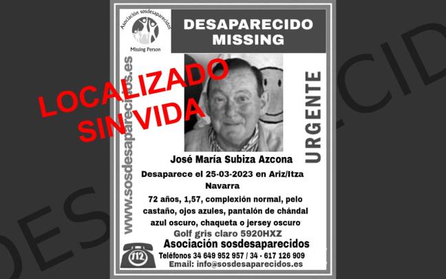 José María Subiza Azcona salió en coche de su casa el sábado y ha sido encontrado este lunes