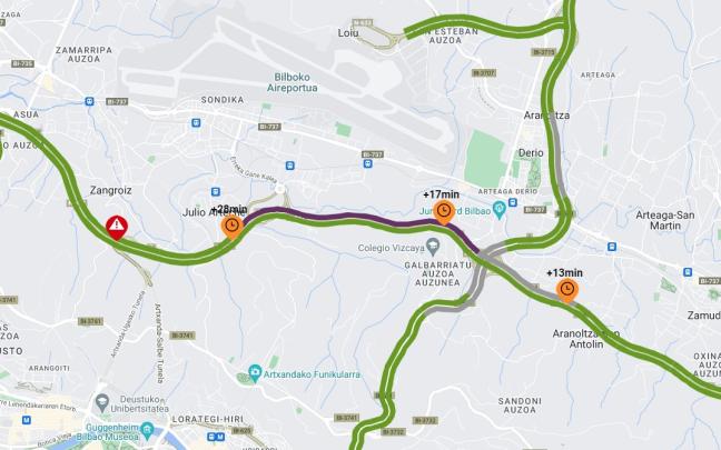 Retenciones kilométricas en el Corredor del Txorierri por un accidente en Sondika