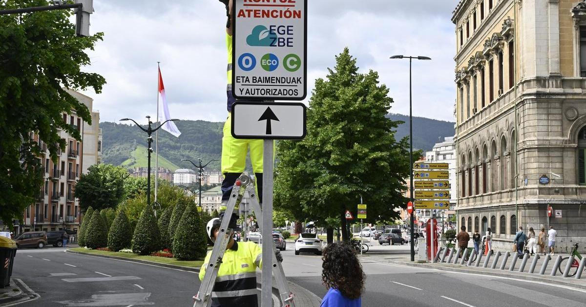 Operarios señalizan una zona de bajas emisiones en Bilbao. / Oskar Gonzalez