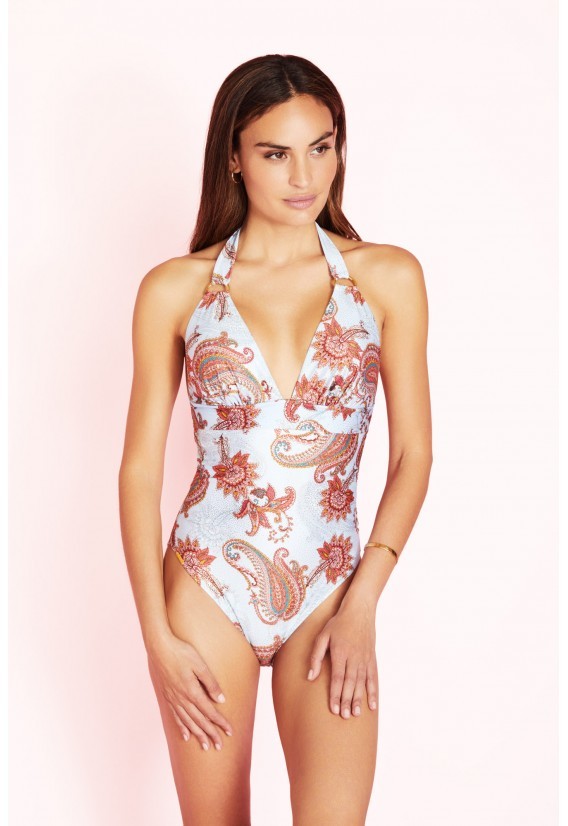 Bañador con escote triangular, sin copa interior y sin aro. Tiene la espalda escotada y tirantes al cuello y a media espalda. Una pieza muy veraniega en tonos blanco y celeste con un estampado floral ideal para lucir esta temporada. Es de Selmark y cuesta 89,95 euros.