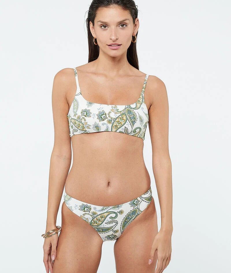 Original bikini con estampado paisley en tonos verdes y silueta favorecedora que resalta las curvas. La braguita es bikini y el top sin aros, de inspiración retro, tiene tirantes ajustables y cierre en la espalda. Ambas piezas son de Etam y el precio de la braguita es de 16,99 euros y el del top, 29,99 euros.
