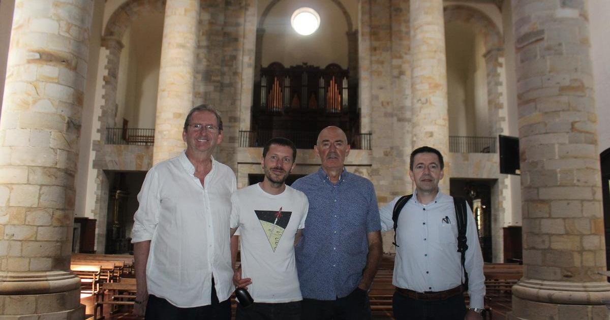 Josu González, Valen Moñux, Ander Errasti y Andoni Larrañaga delante de la fachada oeste de la iglesia, por cuya ventana atravesará la luz solar.