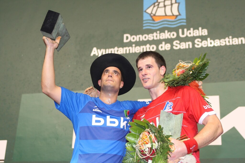 Oinatz Bengoetxea y Abel Barriola, tras la final Manomanista 2008 en el Atano III. Foto: Patxi Cascante
