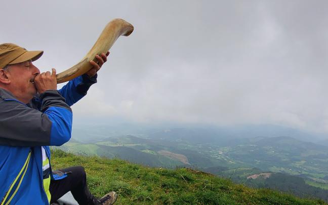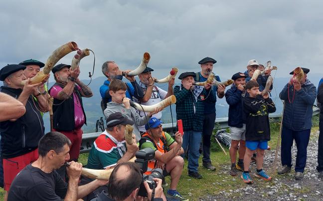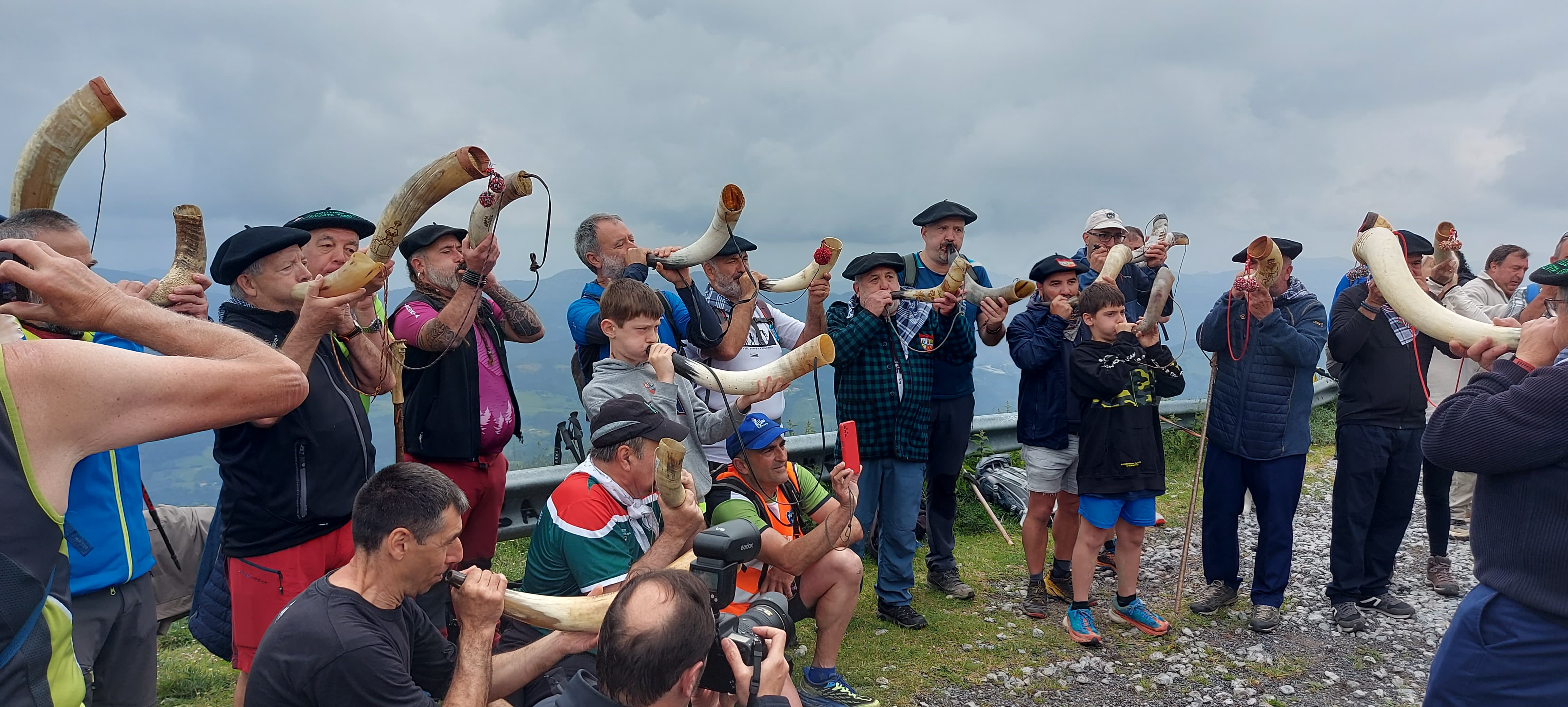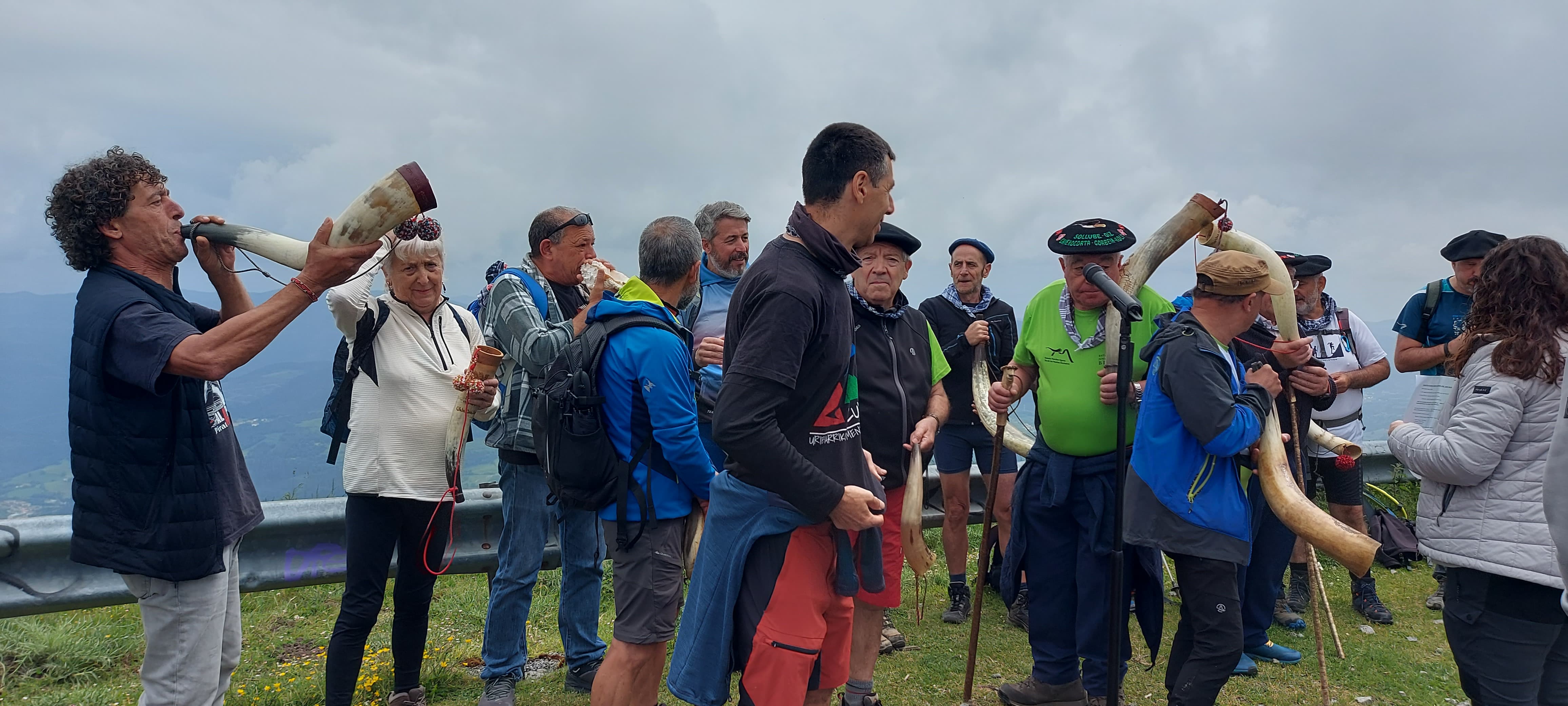 El sonido de las bocinas en la cima estuvo acompañado por los grupos Kriskitin Dantza Taldea y Jaizale Txistulari Elkartea, ambos de Durango, haciendo los honores de abrir el tradicional acto de tañir los cuernos para convocar a Juntas con un aurresku y un baile local.
