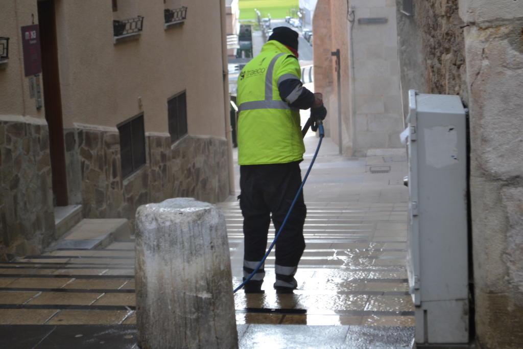 Un operario de limpieza limpia las calles de Agurain / Eva San Pedro Por ello, el máximo mandatario municipal ha presentado denuncia ante la Ertzaintza de todas las pintadas que afectan a los bienes públicos.