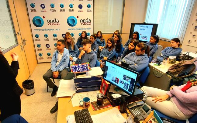 Un grupo de alumnos de 2º de la ESO del centro santurtziarra San José de Calasanz participaba esta semana en la primera experiencia piloto puesta en marcha por Onda Vasca para ofrecer a los adolescentes pautas para detectar y combatir las Fake News.