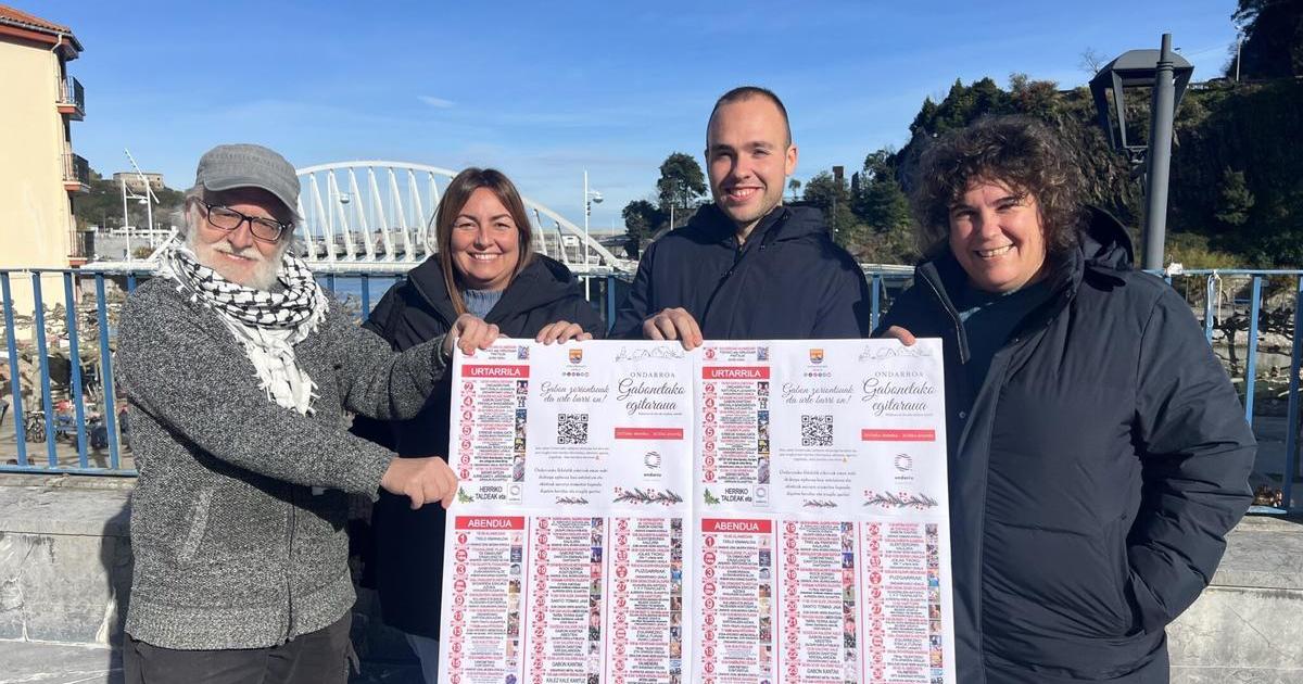 Aurtengo Gabonetan ere egitarau oparoa izango da Ondarroan, urtero bezala herriko taldeen, eragileen eta Udalaren elkarlanari esker. Musika, azokak, kirola, hitzaldiak, antzerkiak, dantza emanaldiak, pailazoak, ‘Kalian gora maria behera’ literatur ibilbidea eta erakusketak izango dira besteak beste, eta herritarrek badute zertaz gozatu datozen asteotan.
