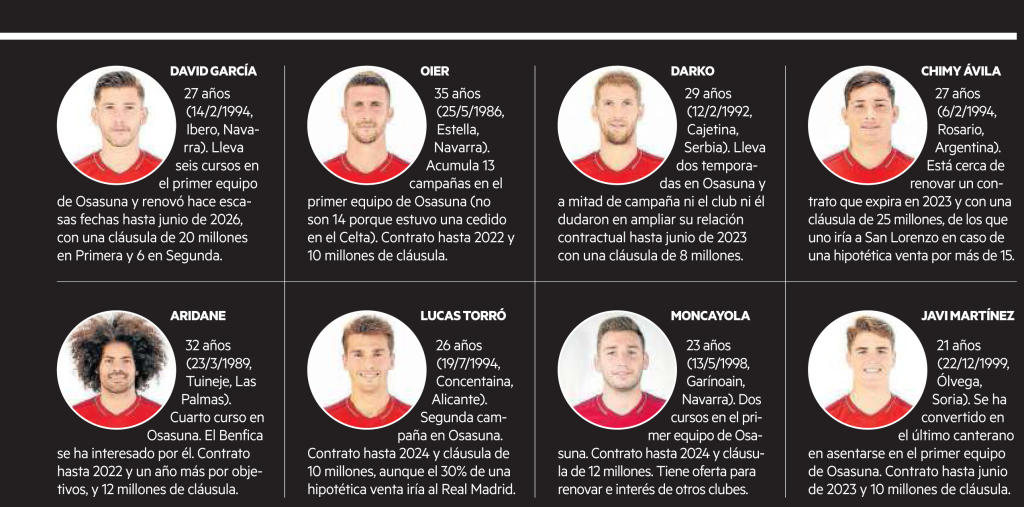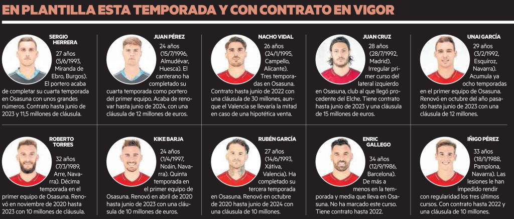 Hasta la fecha, Osasuna ha refrendado con hechos las palabras del gallego y la mejor prueba es la reciente renovación de David García hasta 2026, así como la del portero Juan Pérez hasta 2024, y el hecho de que solo a cinco de los 18 futbolistas de la primera plantilla que han participado con relativa asiduidad en la permanencia de esta temporada se les acabe el contrato en un año. Son los casos de Enric Gallego, Oier, Nacho Vidal, Iñigo Pérez y Aridane, aunque en el caso de este último existe la posibilidad de ampliarlo un curso más en función de determinados objetivos.