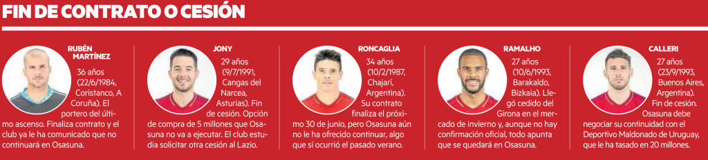 De los que terminan contrato, el portero Rubén Martínez y Adrián ya saben que no seguirán, mientras que con Roncaglia y Jony aún no se ha tomado una decisión. También vuelven los cedidos, con pocas opciones de quedarse. Incluso uno de ellos, Rober Ibáñez, se quedará en el Leganés y reportará un millón de euros a Osasuna si el conjunto pepinero asciende. A falta de confirmación oficial, Jesús Areso y Kike García ya están apalabrados, mientras que el resto lo determinará un mercado al que los clubes acudirán con sus bolsillos mermados.