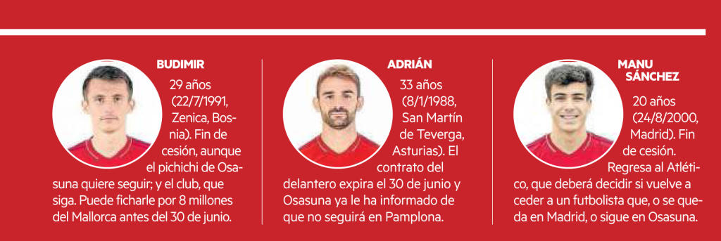 Caso especial es el de Budimir, que llegó cedido desde el Mallorca hasta el final del curso y, tras ofrecer un excelente rendimiento (pichichi rojillo con 11 goles en Liga y otro en Copa), Osasuna debe decidir si paga antes del 30 de junio los 8 millones de la opción de compra voluntaria que pactó y que parece poco probable que pueda rebajar, más aún teniendo en cuenta que el croata irá a la Eurocopa.