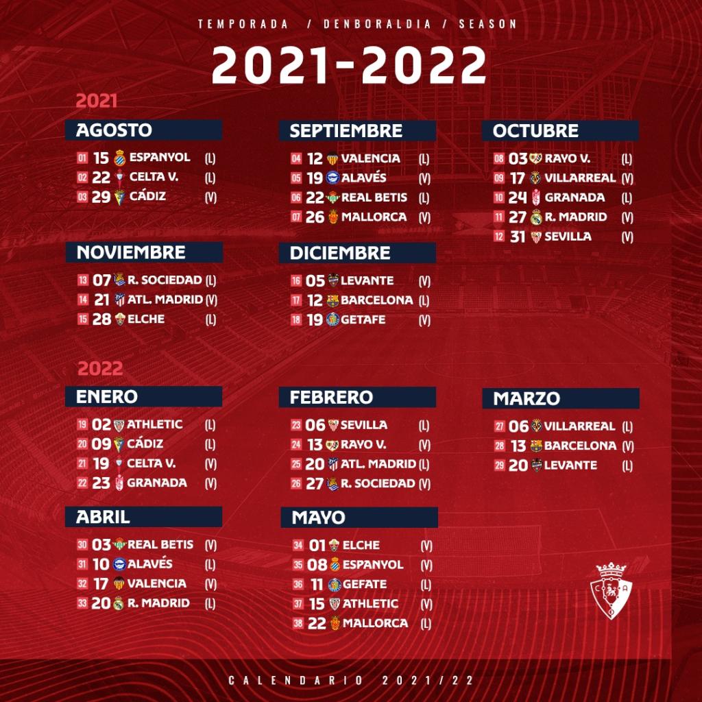 Osasuna afrontará a partir del fin de semana del 15 de agosto una nueva edición de LaLiga en Primera División y lo hará recibiendo al Espanyol en la primera jornada, mientras que finalizará el campeonato recibiendo al Mallorca en El Sadar en el próximo mes mayo.