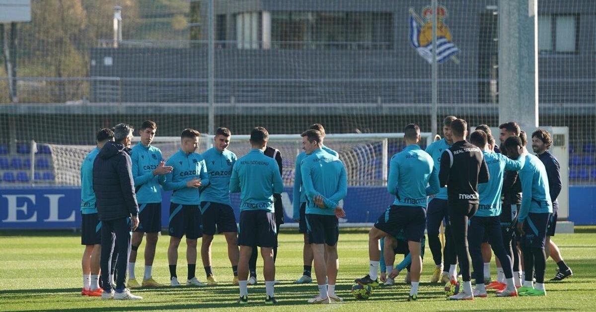 Los jugadores de la Real, durante el entrenamiento en Zubieta. / RUBEN PLAZA