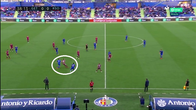 Ante este panorama, la Real aprovechó para orientarse a la zona del hombre libre (Zaldua), con lo que conseguía que Rubén saltara a presionarle y descuidara su espalda, en la que recibía Merino (blanco) cayendo a banda.