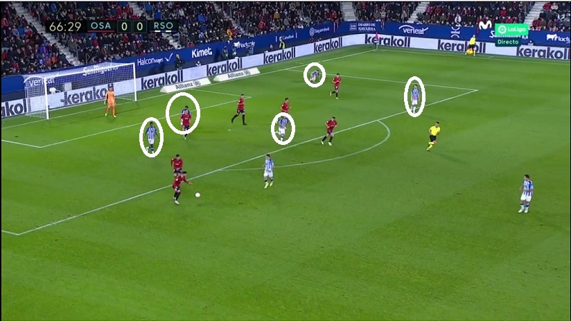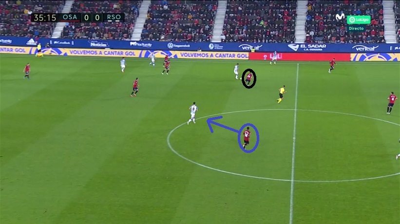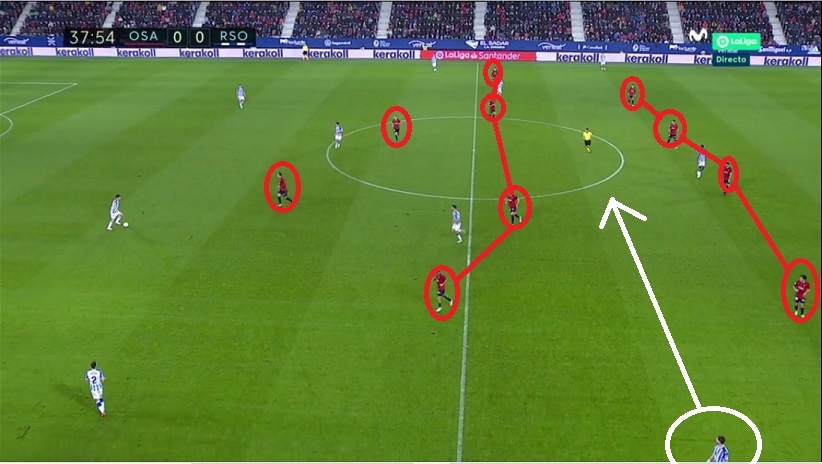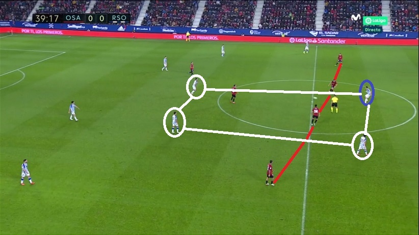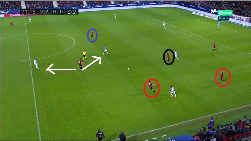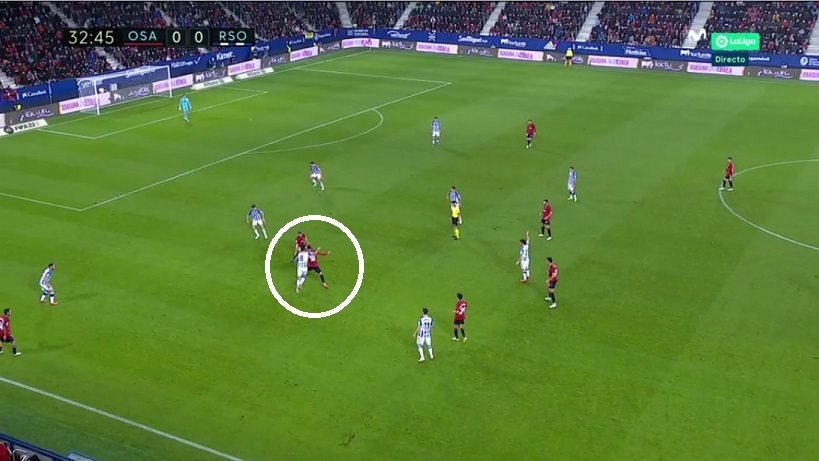 Los txuri-urdin se mostraron muy eficaces en este registro de repliegue. Lo fueron hasta el punto de que la ocasión de Brasanac ante Remiro llegó tras otro tipo de acción: transición de Osasuna iniciada con cinco realistas por delante del balón tras centro de Zaldua.