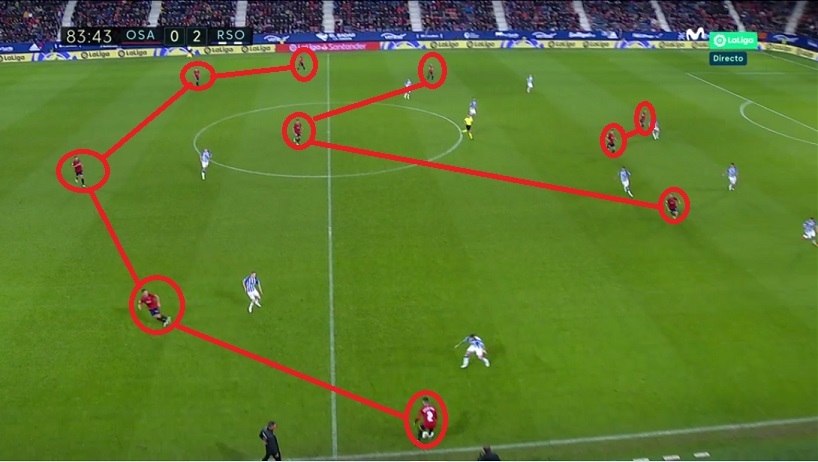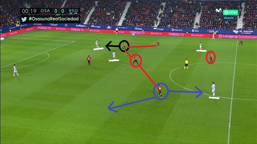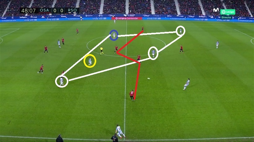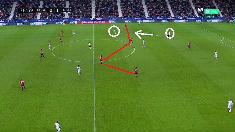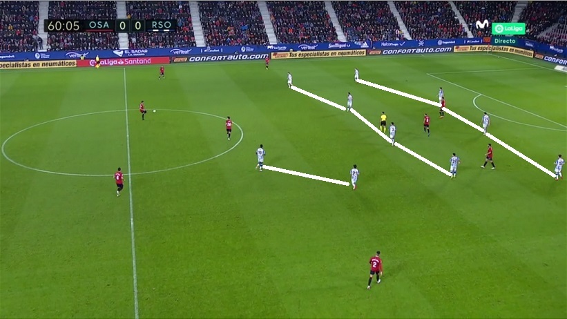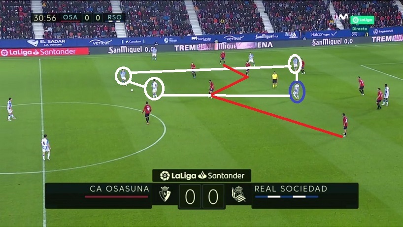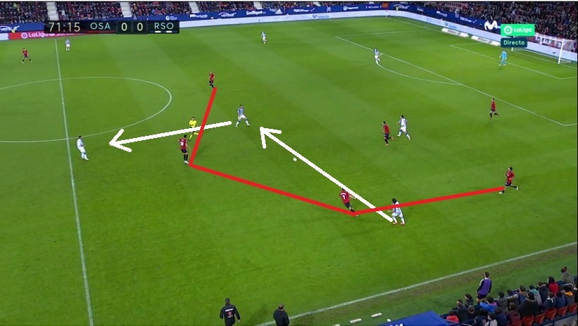 Esa posición de Merino en derecha fue una muy buena vía de salida para la Real ante la línea de cuatro medios de Osasuna.
