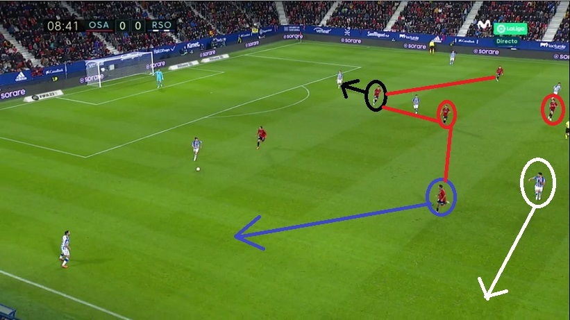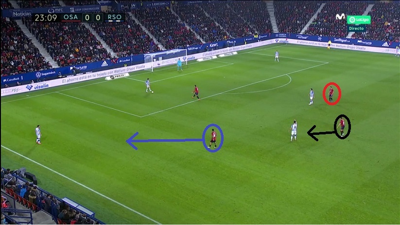 La Real se vio obligada así a, en mayor medida, iniciar sus ataques desde el sector izquierdo, situación que Osasuna también controló gracias a la basculación interior de Rubén García para tapar a Merino, cuando Torró se escoraba al lado fuerte.