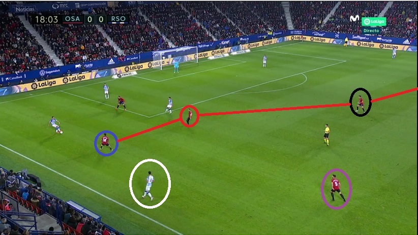 Pero estuvo muy bien Jagoba variando a una especie de 4-4-1-1 y cambiando la forma de presionar. Brasanac (rojo) era el mediapunta. Y Torró (negro) el pivote izquierdo: así podía emparejarse con Merino y Rubén salía 'tranquilo' a por Zaldua. Le Normand quedaba flotado muy a menudo.