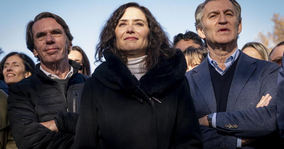 José María Aznar, Isabel Díaz Ayuso y Alberto Núñez-Feijóo, en el acto del domingo. / EP