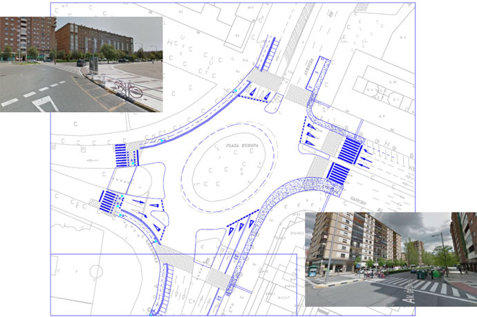 El espacio para el nuevo carril se ganará a la calzada. En las dos rotondas, tanto en la Plaza de Europa como en la confluencia con las calles Ermitagaña y La Rioja, se modificarán los anillos de circulación de los vehículos.