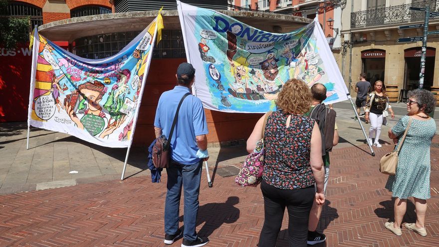 Antes de que Pamplona sonase a San Fermín, por la mañana las peñas ya han desplegado su arsenal festivo en la plaza de San Francisco y aledaños. 16 pancartas a sol y sombra con las alcaldadas de Maya y los tránsfugas Adanero y Sayas como indiscutibles protagonistas. “Nos hace falta más tela, el espacio se nos queda pequeño para todo el juego que dan los políticos”, se reía Erlantz Esteban, autor de las pancartas de Bullicio, Jarana y Rotxapea. “Cada año se superan. Navarra no es una tierra simple, rizamos el rizo más que en otros sitios. Y a mí me facilita bastante el trabajo”, ha dicho.