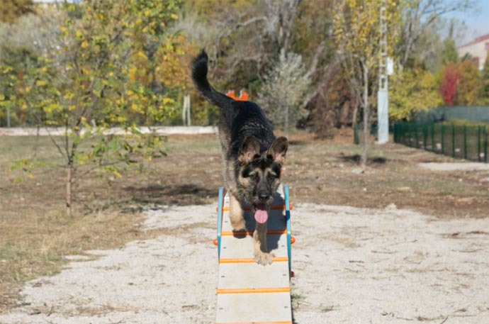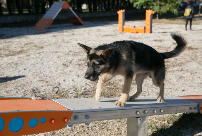 Los elementos del circuito ayudan a su correcta utilización con instrucciones e indicadores. Así, el balancín cuenta con zonas de contacto diferenciadas en varios colores para delimitar la posición idónea en el obstáculo. La rampa de subida y bajada identifica también las zonas de contacto, constituidas a través de listones de polietileno. La pasarela, por su parte, está provista de listones, que evitan deslizamientos y facilitan el acceso al animal.