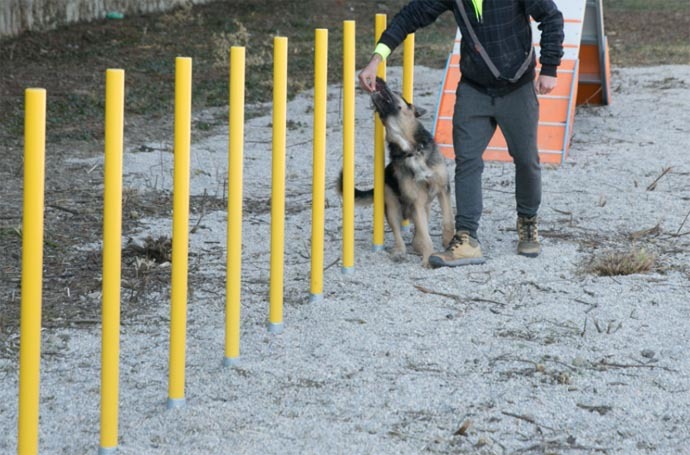 Las vallas de salto que se van a instalar cuentan con un indicador de altura y categoría grabado en relieve. Su barra de salto está elaborada en aluminio ligero, fácil de derribar y con sistema de tope en los extremos para facilitar el desplazamiento a través de las distintas posiciones y evitar robos. El circuito se compone además de otros tres elementos de salto. Uno de ellos, basado en un muro, está elaborado a través de un sistema de tejas móviles de polietileno antideslizante de alta densidad, que se pueden derribar para evitar daños a los perros en caso de colisión pero que permanecen unidas al muro para evitar robos. Por su parte, el aparato de salto de longitud cuenta con elementos de caucho antideslizante. Se deslizan fácilmente a través de las guías para adaptar la altura a las diferentes categorías. Tienen un sistema de bloqueo para evitar que se muevan. Además, el nuevo circuito Agility de Trinitarios cuenta con una rueda de salto regulable en altura para ajustarse al tamaño de cada perro.