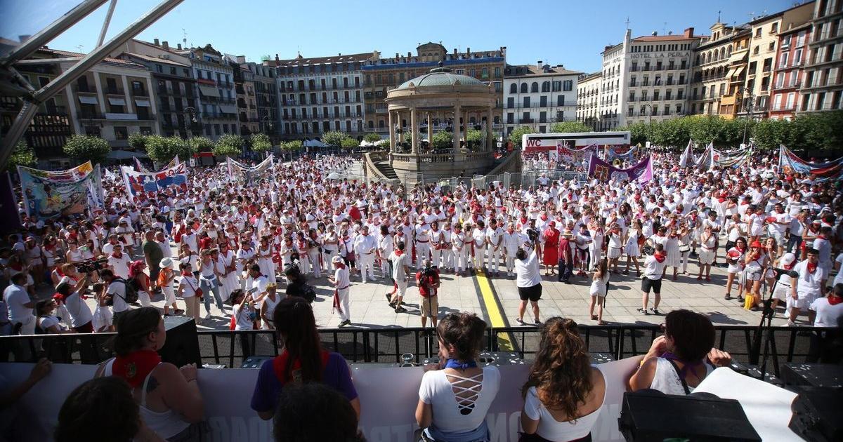 La concentración ha sido convocada por el movimiento feminista y el movimiento popular y ha contado con la presencia del vicepresidente del Gobierno de Navarra, Javier Remírez, y el alcalde de Pamplona, Enrique Maya, entre otros representantes, así como de las peñas de San Fermín.