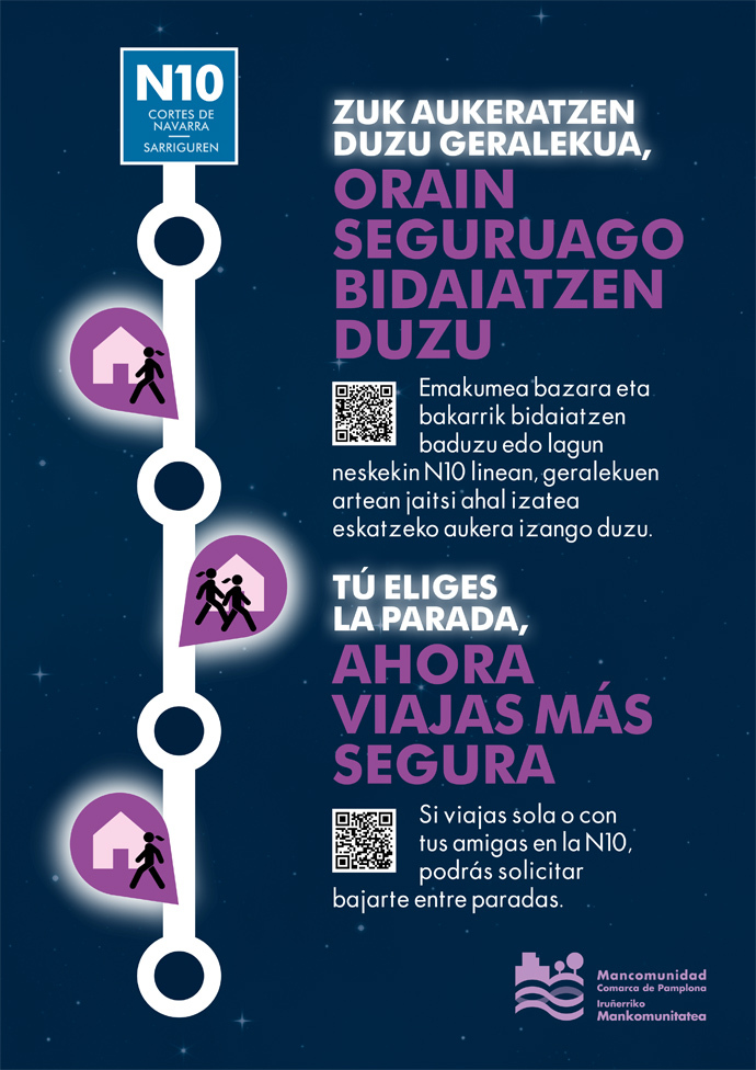 La Mancomunidad de la Comarca de Pamplona pone en marcha este martes, 8 de marzo, una prueba piloto en el servicio nocturno del Transporte Urbano Comarcal para habilitar paradas intermedias a demanda dirigidas a mujeres que viajan solas o en grupo. La prueba, que se realizará la línea N10 (C/ Cortes de Navarra - Sarriguren), inicialmente estará operativa durante tres meses, hasta el día 8 de junio.