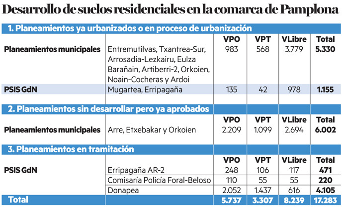 Un potencial de 17.000 viviendas que incorpora las 4.100 viviendas -cifra ahora mismo en revisión- que tienen cabida en el antiguo PSIS de Donapea, pero que no tiene en cuenta en cambio, dada su complejidad y dificultades de desarrollo, otras dos grandes bolsas residenciales también vinculadas a la burbuja inmobiliaria -al igual que lo fue Donapea cuyo proyecto original fue anulado por el Supremo- con las que el gobierno de UPN impulsó, por un lado, más de 9.000 viviendas entorno al Tren de Alta Velocidad de Etxabakoitz, y por otro la ciudad fantasma llamada Guenduláin, con más de 18.000 viviendas, diseñada a once kilómetros de Pamplona.