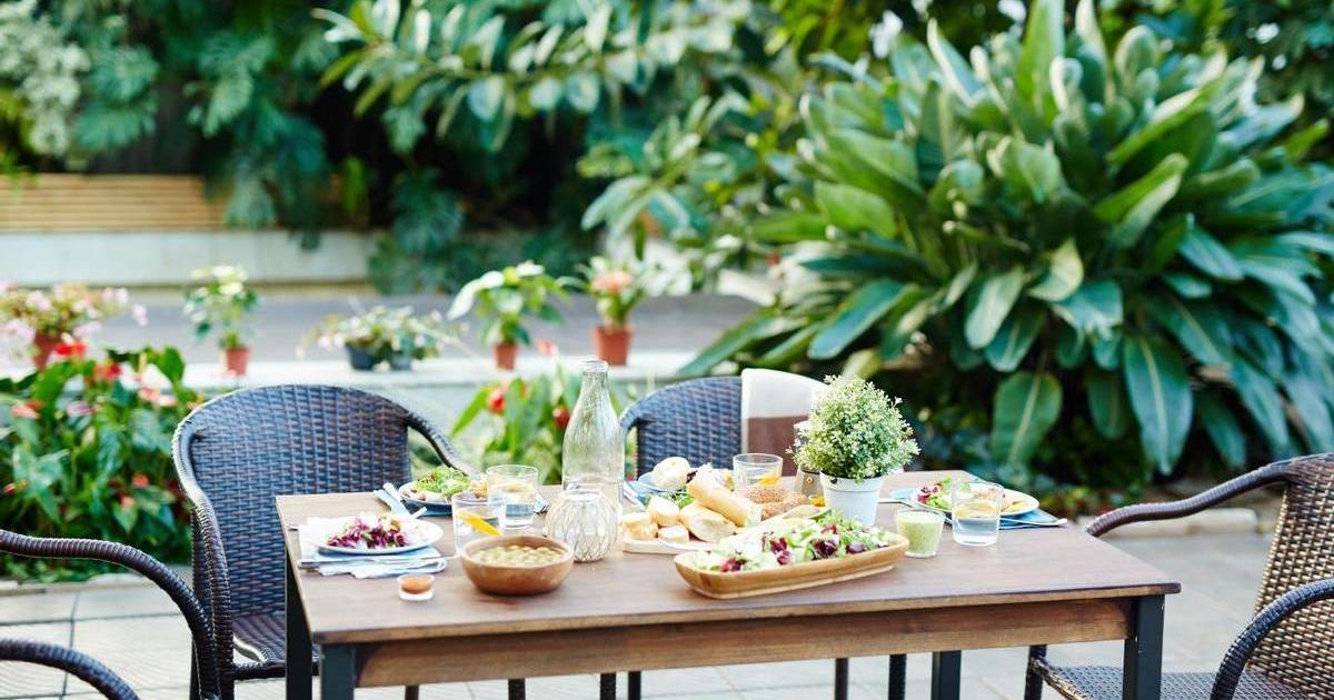 Esta es la vajilla de Ikea que todos quieren: cuesta menos de 10 euros y es perfecta para las barbacoas de verano / Table with homemade food prepared for friends gathering with wicker armchairs around in the garden