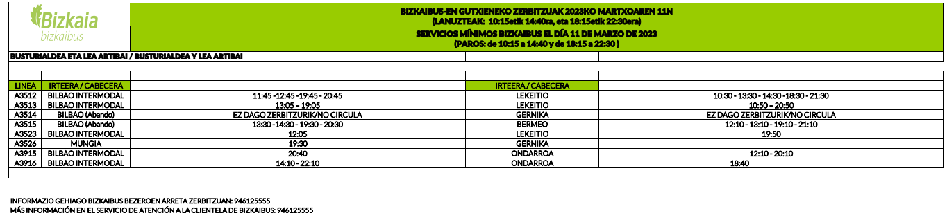 Hoy 2 de marzo, jueves, los paros se centran en las líneas de Busturialdea y Lea Artibai en tres tramos horarios que te detallamos a continuación: