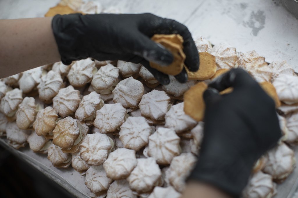 El día anterior a cualquier festividad - Semana Santa, el día de la Virgen, Navidadad o San Fermín - es sinónimo de un incremento de ventas y trabajo. "La labor que hacen las personas del obrador durante todo el año y, en especial, en esas fechas es impecable", recalca la gerente. Y añade: "Al ser pastas del día, antes de abrir a las 09.15 horas las puertas al cliente, los confiteros ya deben haber elaborado con harina, huevo y mantequilla los cuatro tipos de masas: la de los cocos, los garrotes, bizcochos y pastas".
