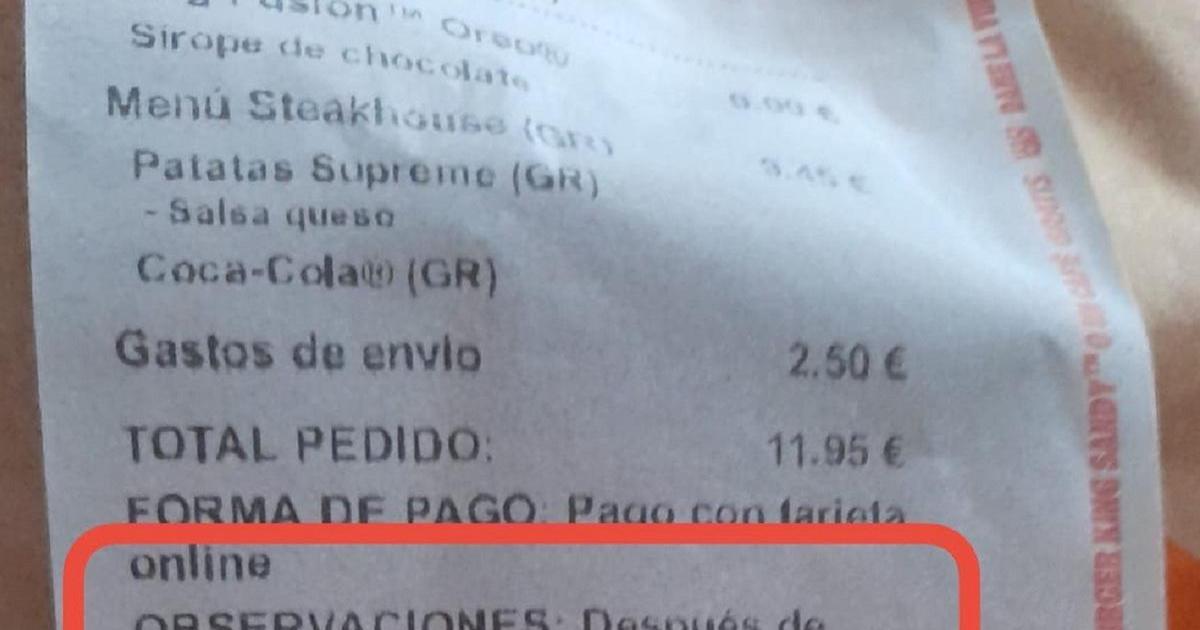Es ese apartado de observaciones el que está dando mucho que hablar en la popular cuenta de la red social X Líos de Vecinos por la foto viral que han subido en una de sus últimas publicaciones. Han compartido el ticket de un pedido realizado a la hamburguesería Burger King, en el que aparece un menú con sus patatas fritas, su bebida y su postre, con un coste total de 11,95 euros, en el que se incluyen los 2,50 euros del envío a casa.