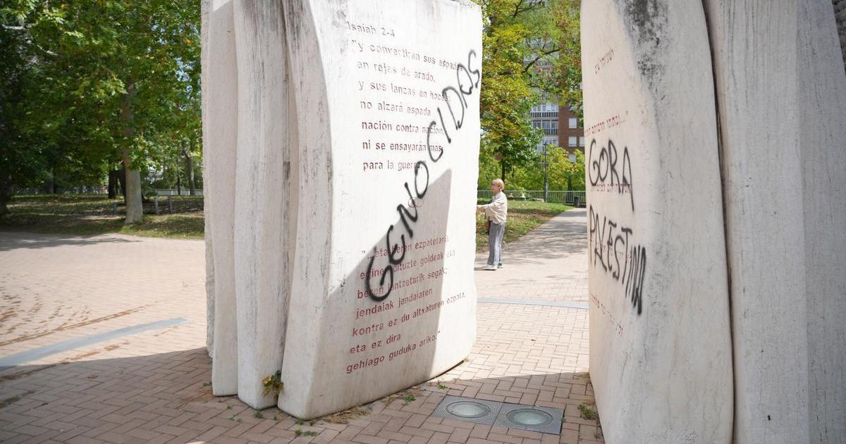 Pintadas de "genocidas" y "Hamas mátalos" sobre la escultura en memoria de la comunidad judía en Vitoria