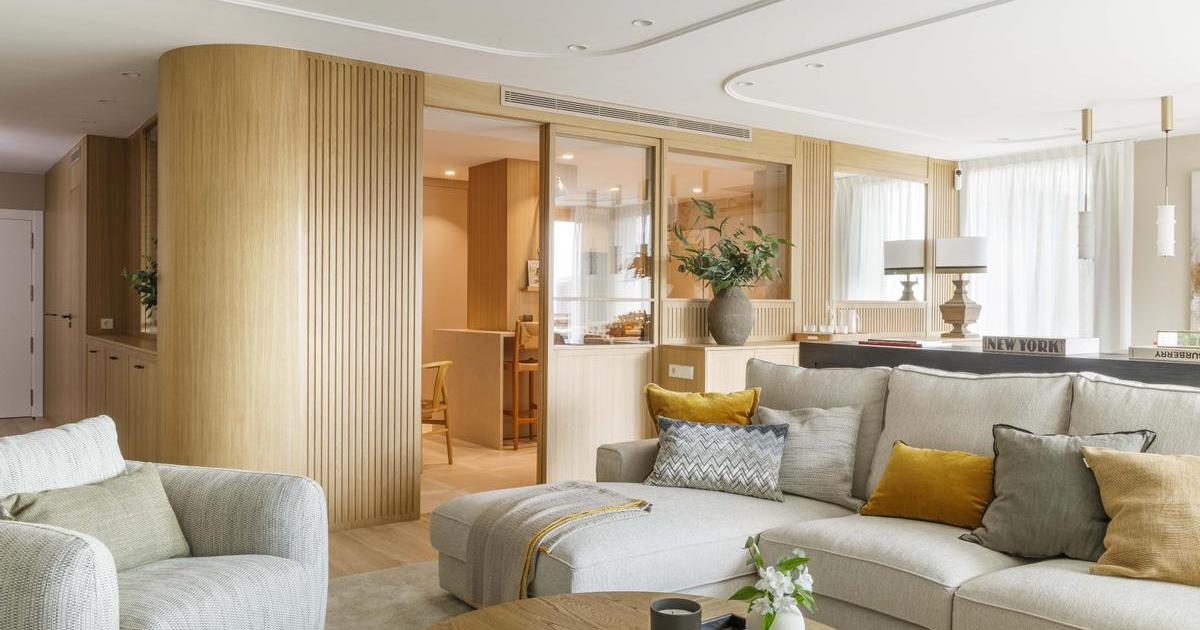Nada más cruzar la puerta de entrada, la vivienda sorprende por su amplitud y claridad. El acceso se abre directamente al salón, y una ventana interior que conecta con la cocina deja pasar aún más luz natural al recibidor. A ambos lados, muebles a medida resuelven la entrada con ingenio: un banco integrado con armarios que aportan orden y un mueble bajo en madera natural que combina almacenaje con ligereza visual. Un comienzo elegante y práctico que marca la personalidad de la casa.